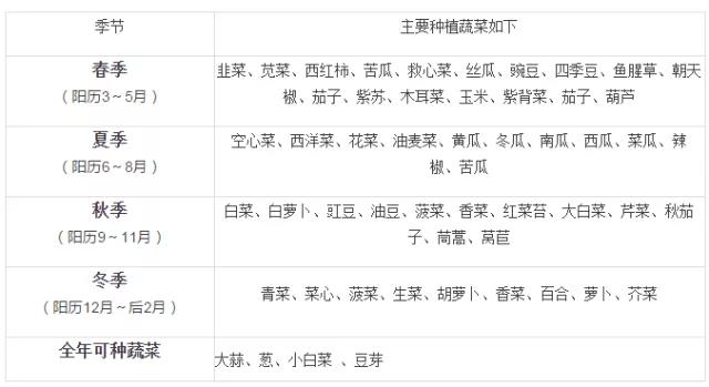 12月:甘蓝、油菜、韭菜、白菜、菠菜、芥蓝、生菜、葱、芫荽、芹菜、青花菜、豌豆、胡萝卜、大蒜、萝卜、花椰菜、茼蒿、茄子、番茄、辣椒。
