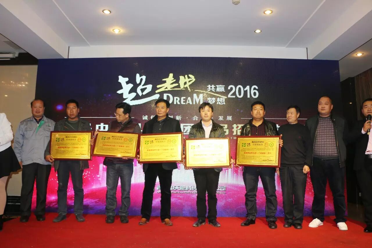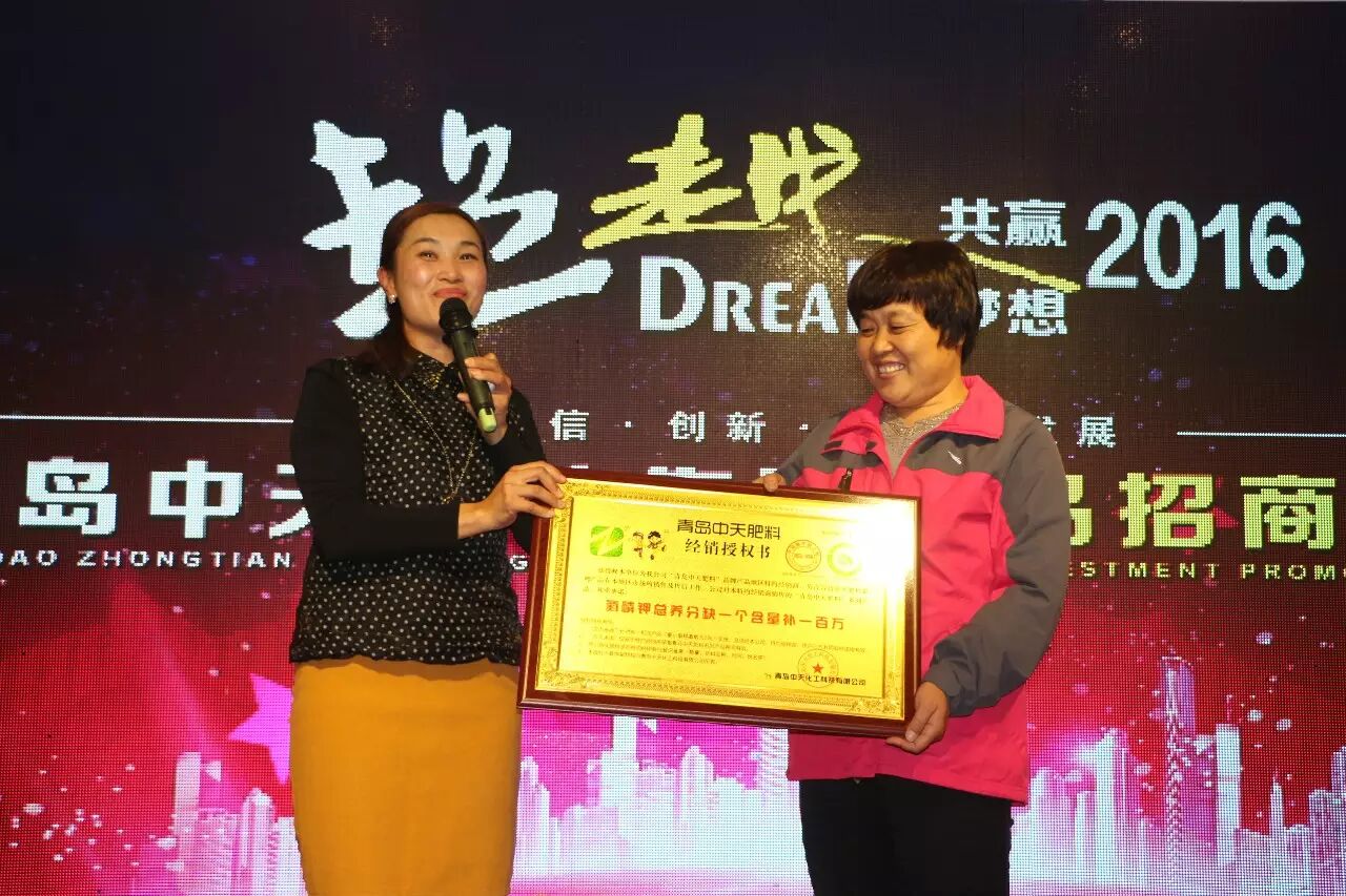 获得青岛中天肥料百万承诺经销许可的优秀经销商上台领取百万承诺经销奖牌。